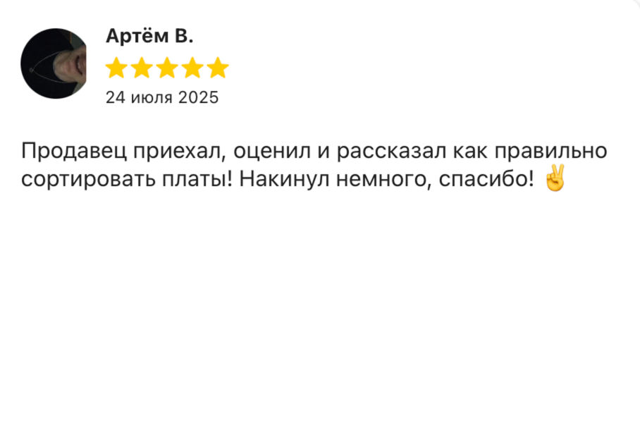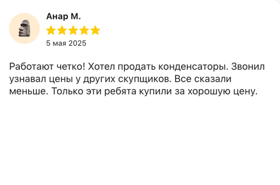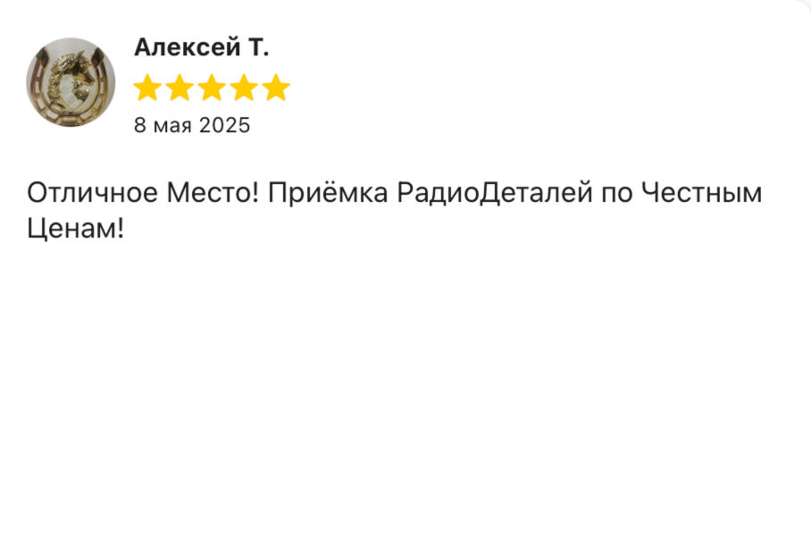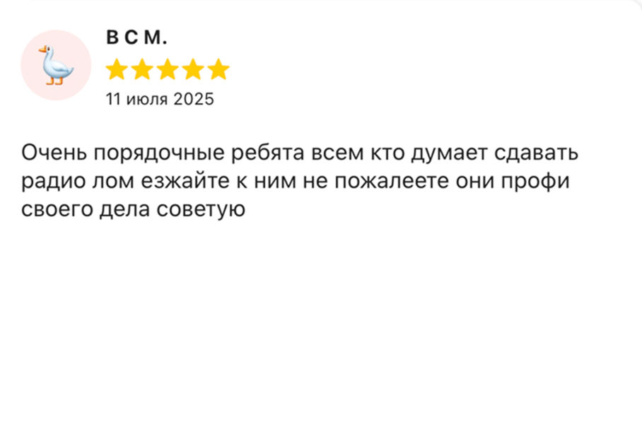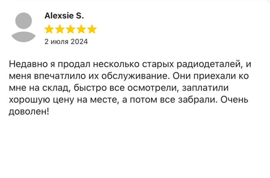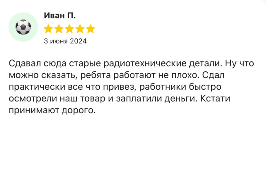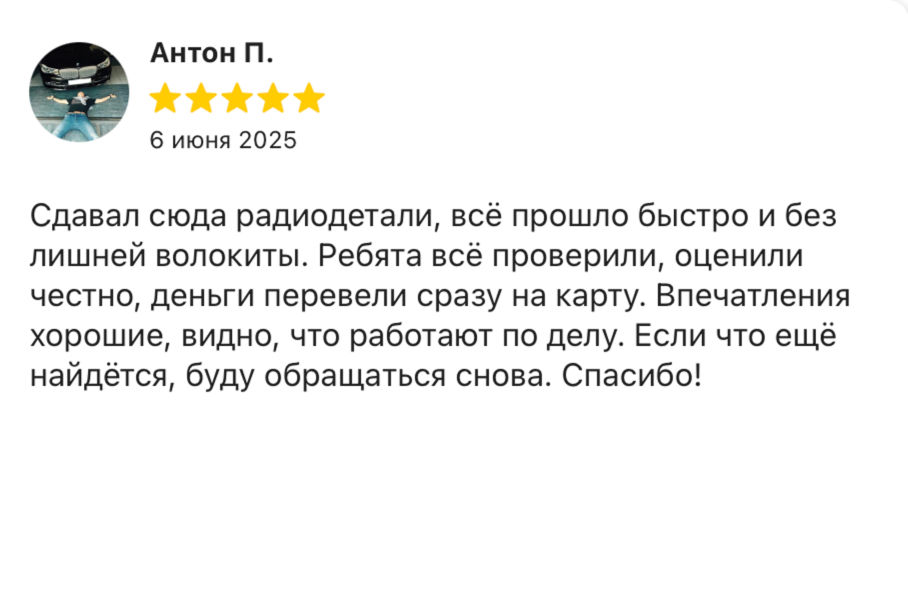 «Радио детали» более 10 лет занимается приёмом радиолома с содержанием драгметаллов. Мы принимаем всё: от микросхем и конденсаторов до оборудования и техники. Работаем с физическими и юридическими лицами, предлагаем лучшие цены на рынке и удобные условия.